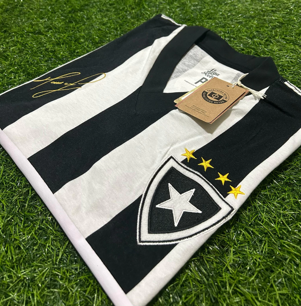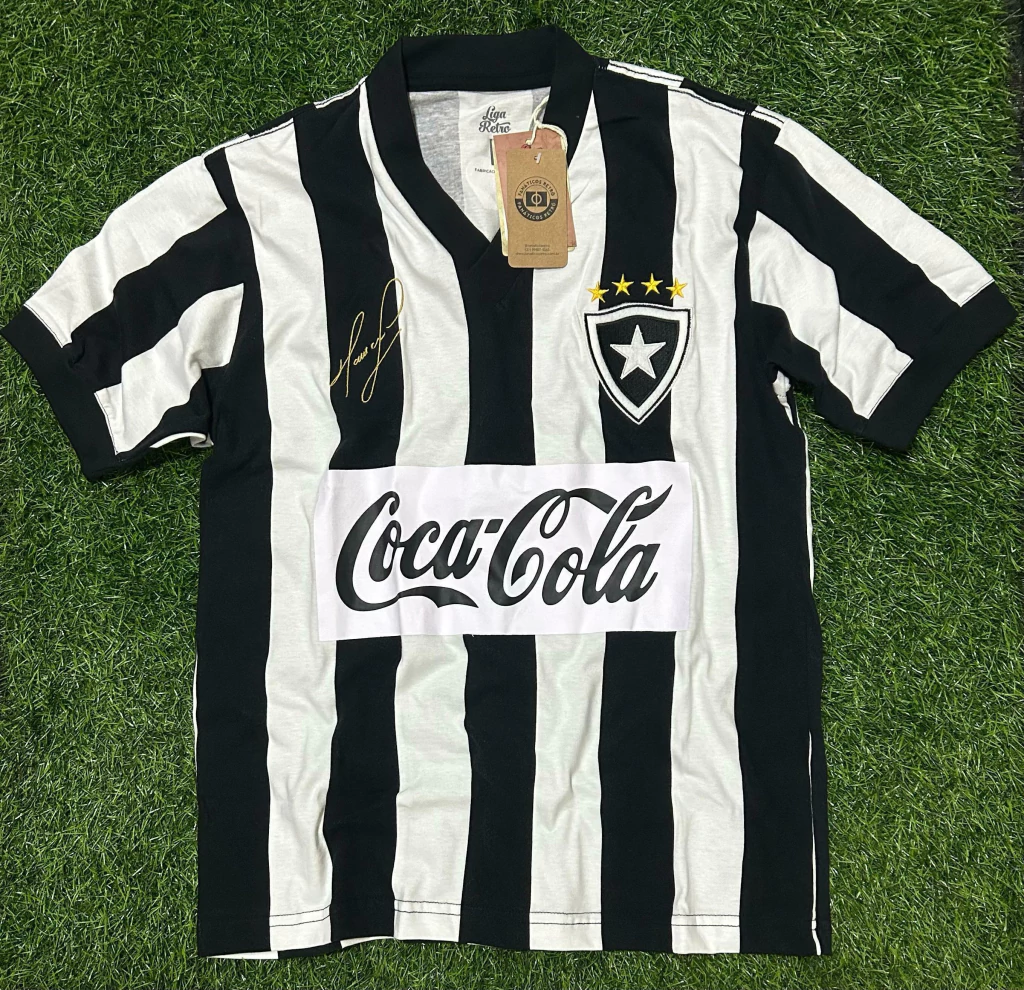 Camisa Retrô do Botafogo de 1989. Histórica retrô do Glorioso da Estrela Solitária autografada pelo ídolo Mauricio, autor do gol do título estadual. A peça é confeccionada em algodão listrado, possui o escudo bordado ao lado esquerdo do peito, além do autógrafo ao lado direito e o patrocinador colado, como na época.