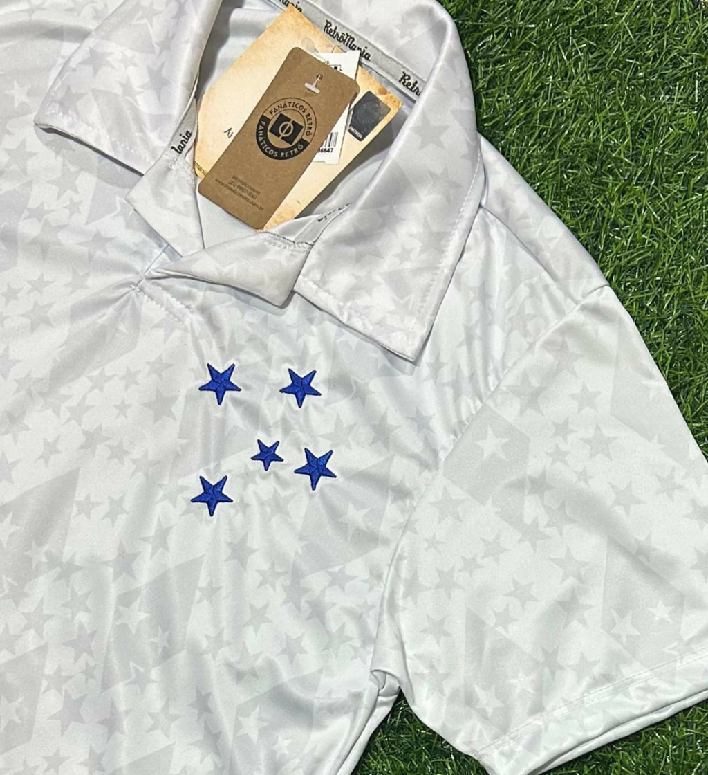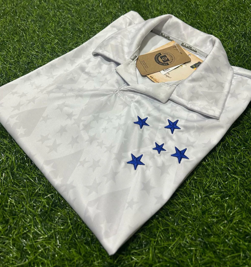 Reviva a história do Cruzeiro com a retrô oficial de 1993 em homenagem ao Título da Copa do Brasil. Camisa confeccionada em Dryfit branco com marcas d'água da época, gola polo e as estrelas bordadas na cor azul.